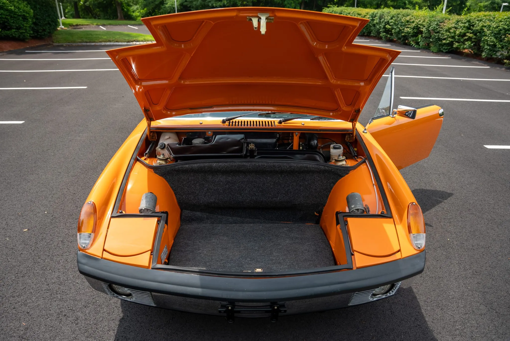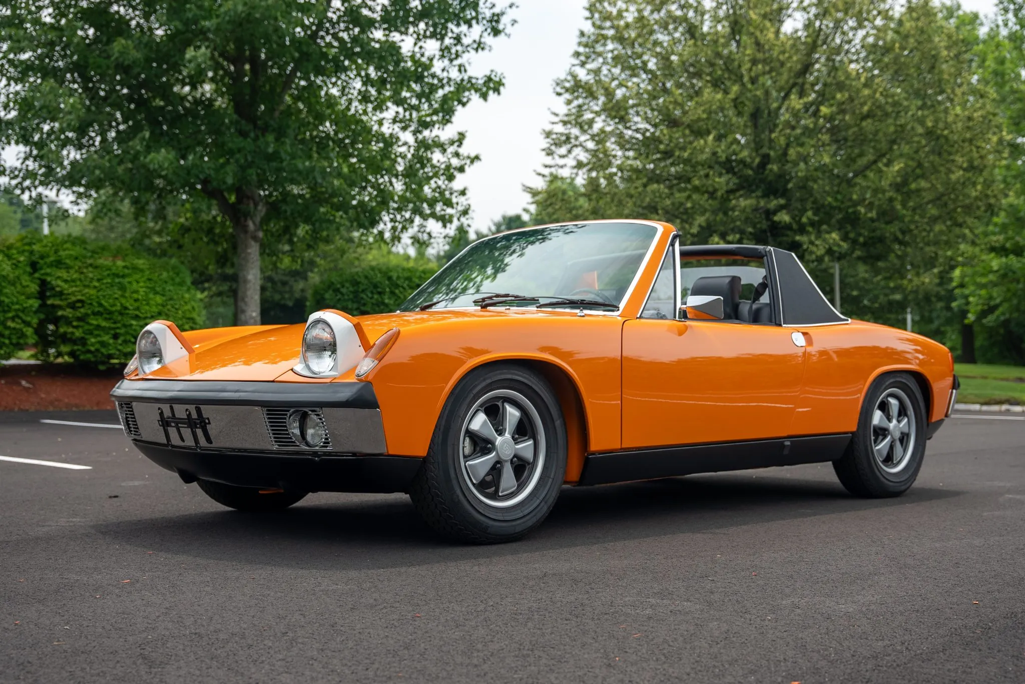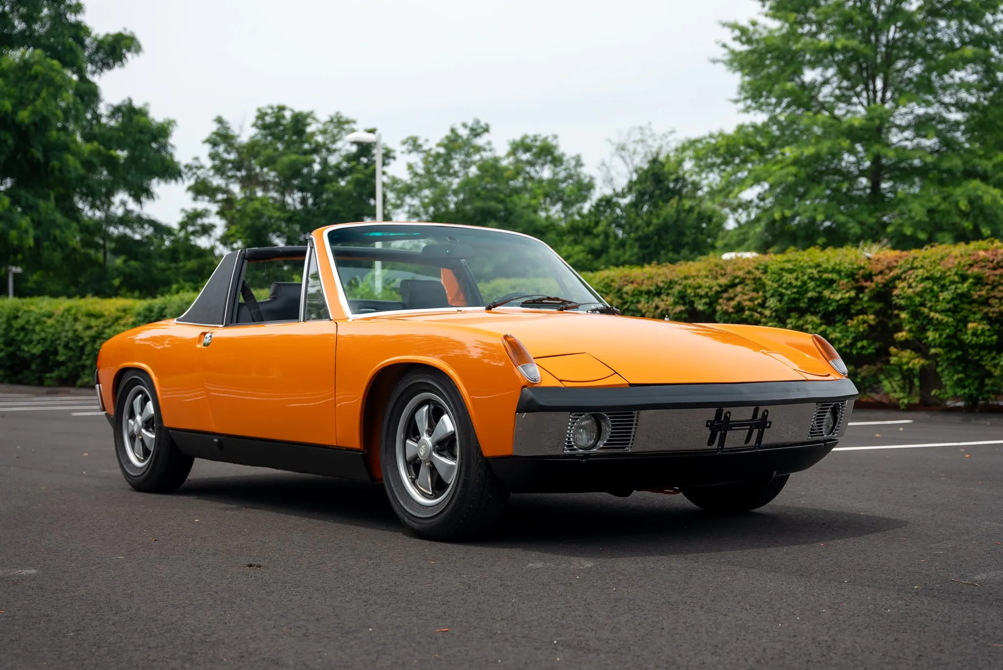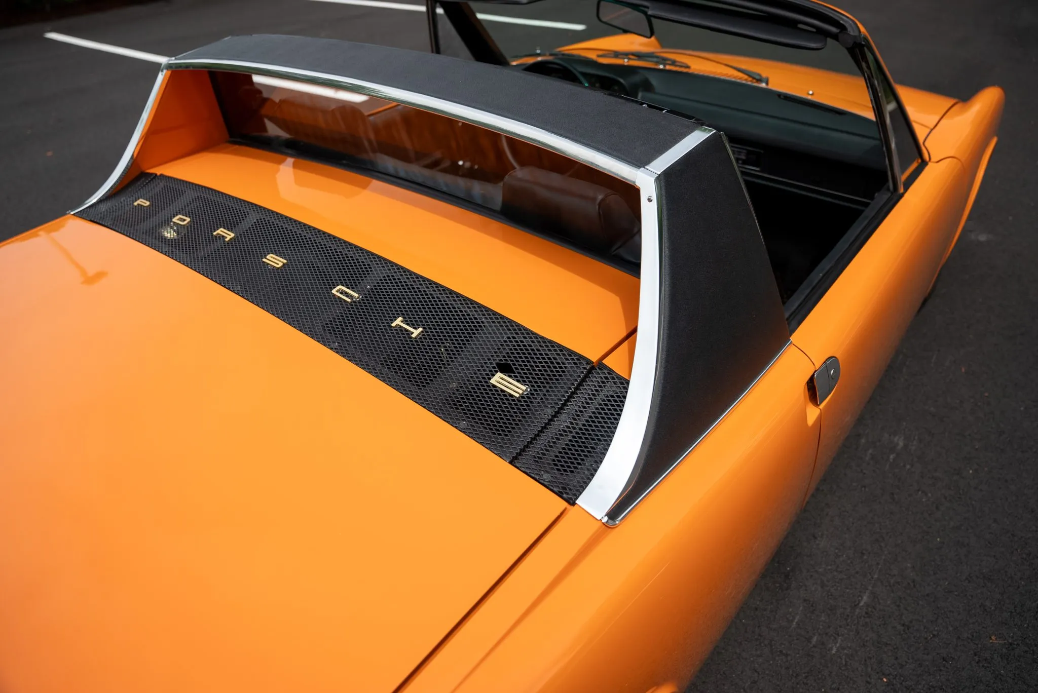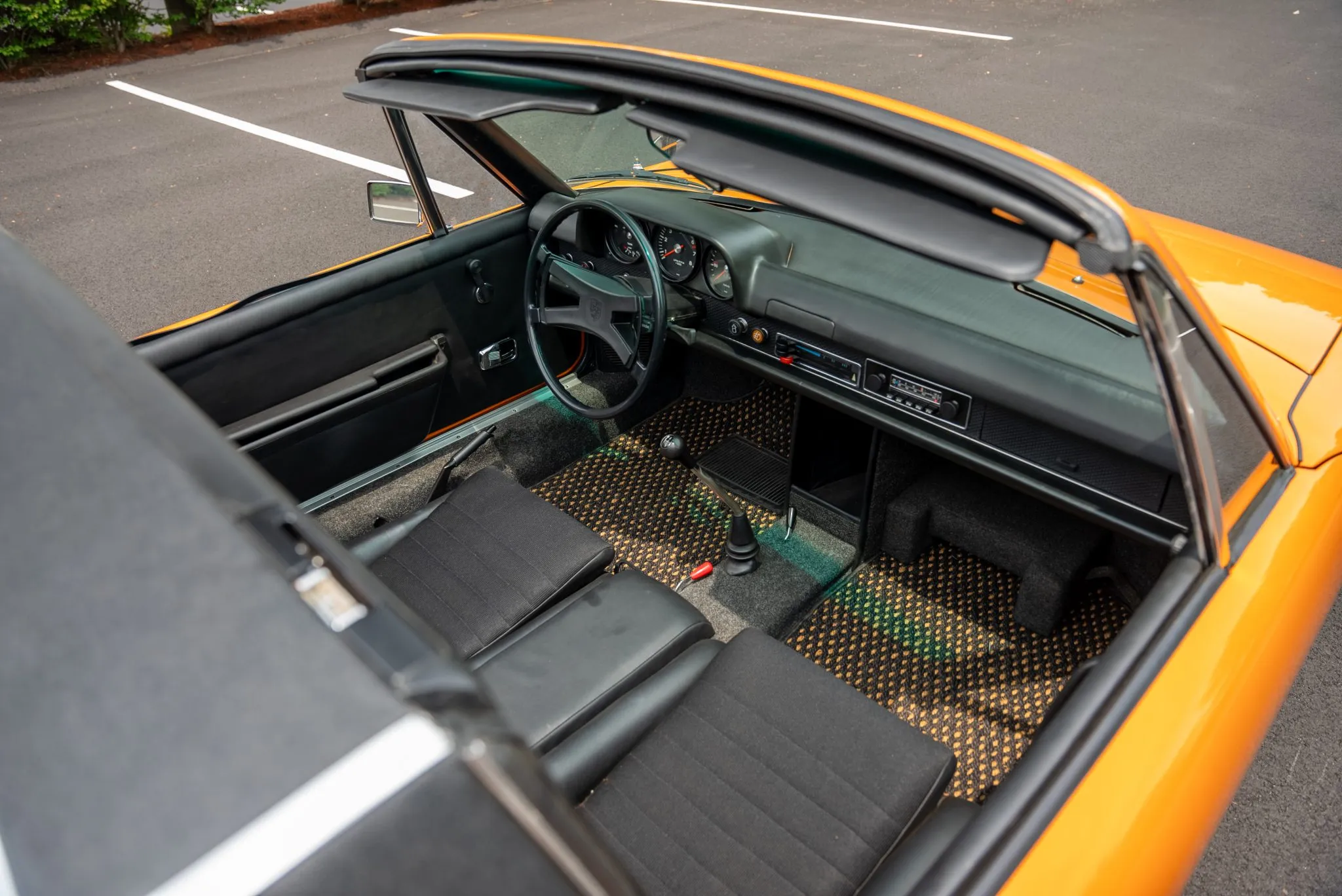 The exterior was carefully refinished after rust repairs were completed on the front fenders and left rear quarter panel. The car’s Targa top has been reupholstered, and various trim pieces were refinished to ensure the car retains its factory-quality appearance. Additional work included the restoration of the driving lights and the replacement of rubber seals throughout. Noteworthy features include pop-up headlights, a black removable Targa top, black sail panels, polished bumper trim, and European-market VW/Porsche badging on the rear panel.