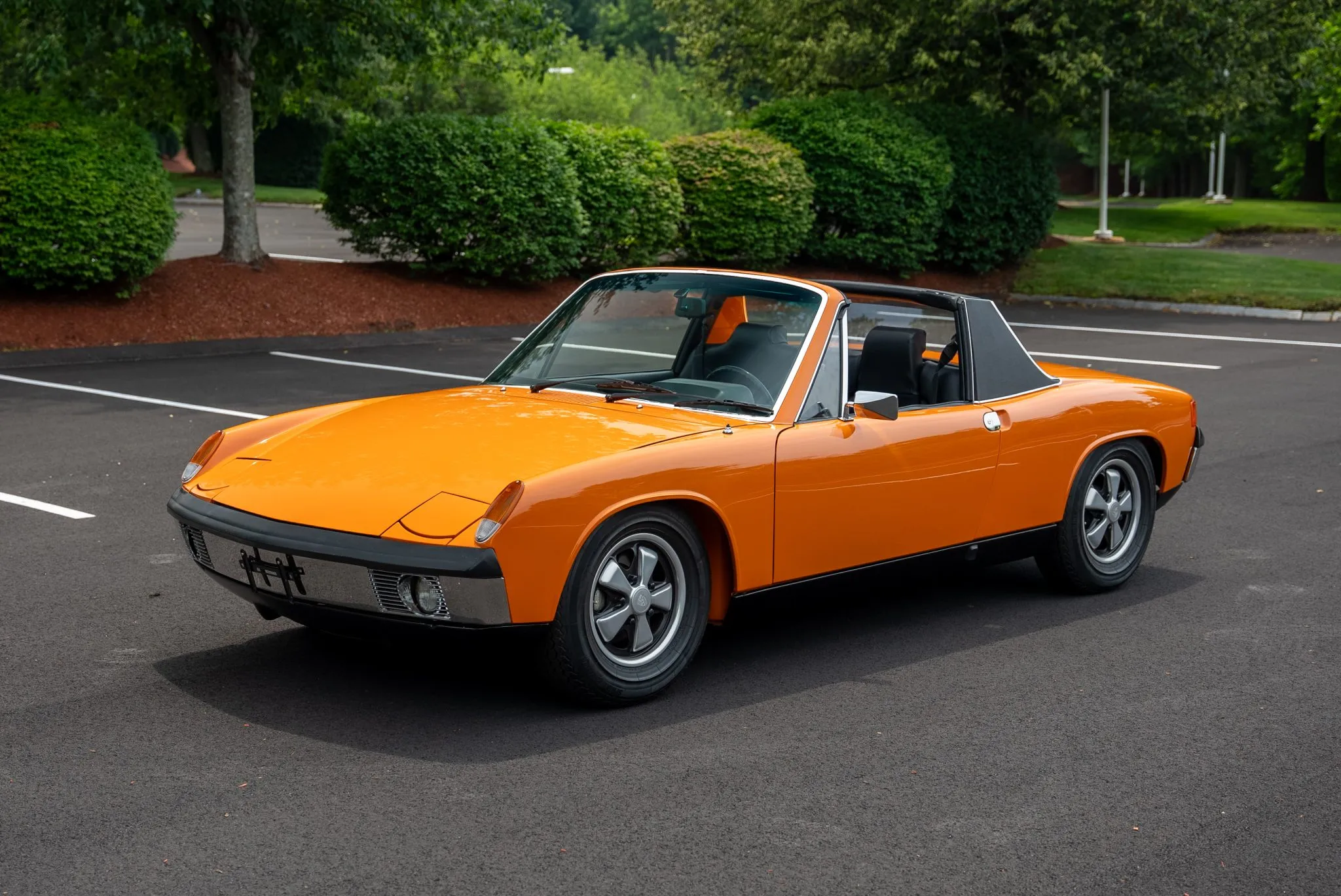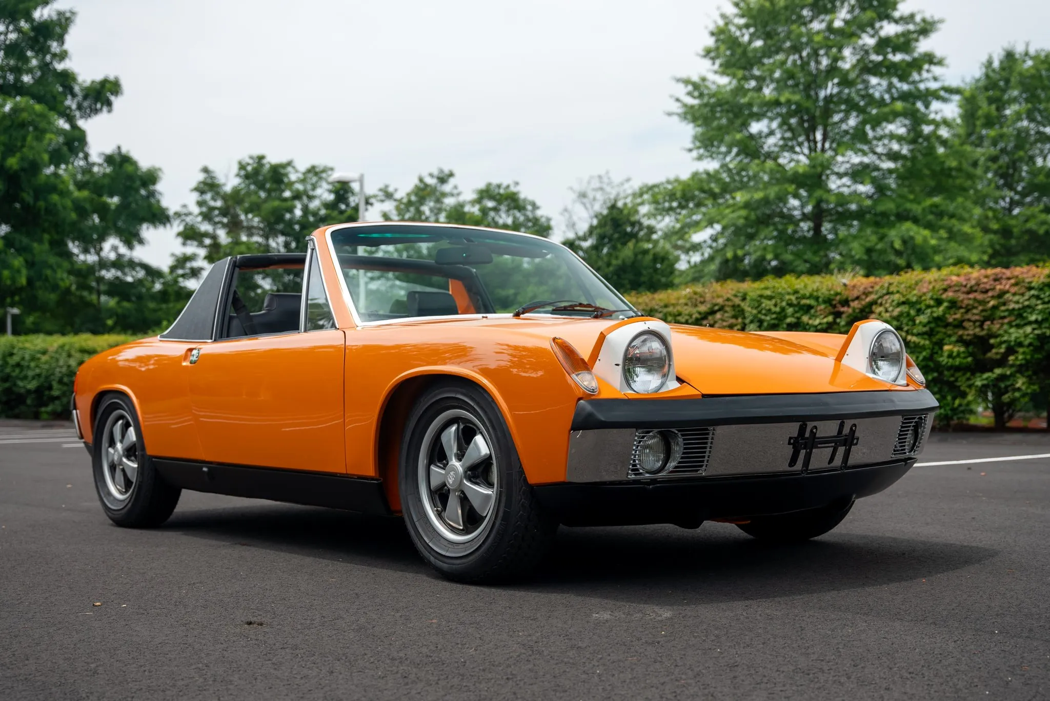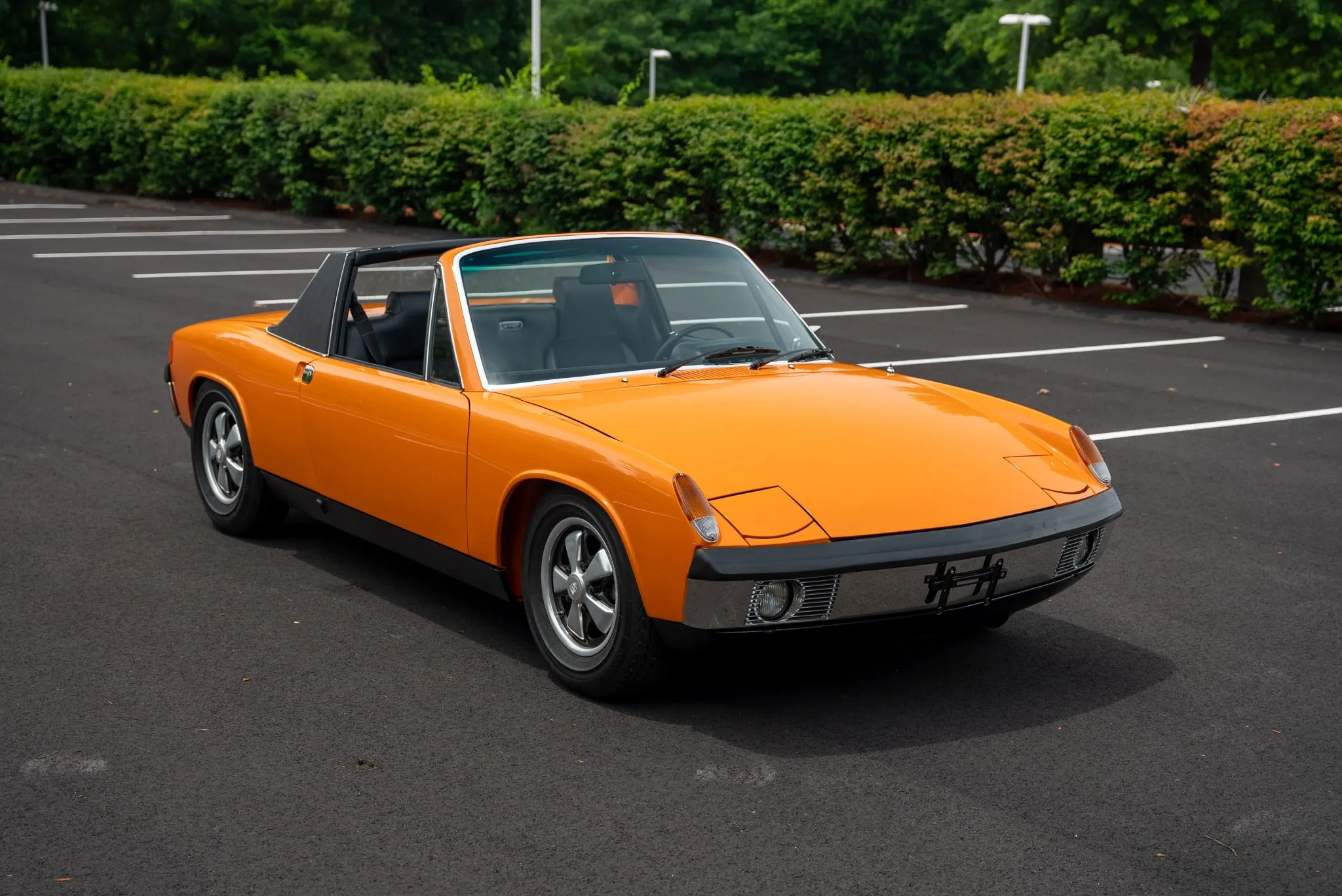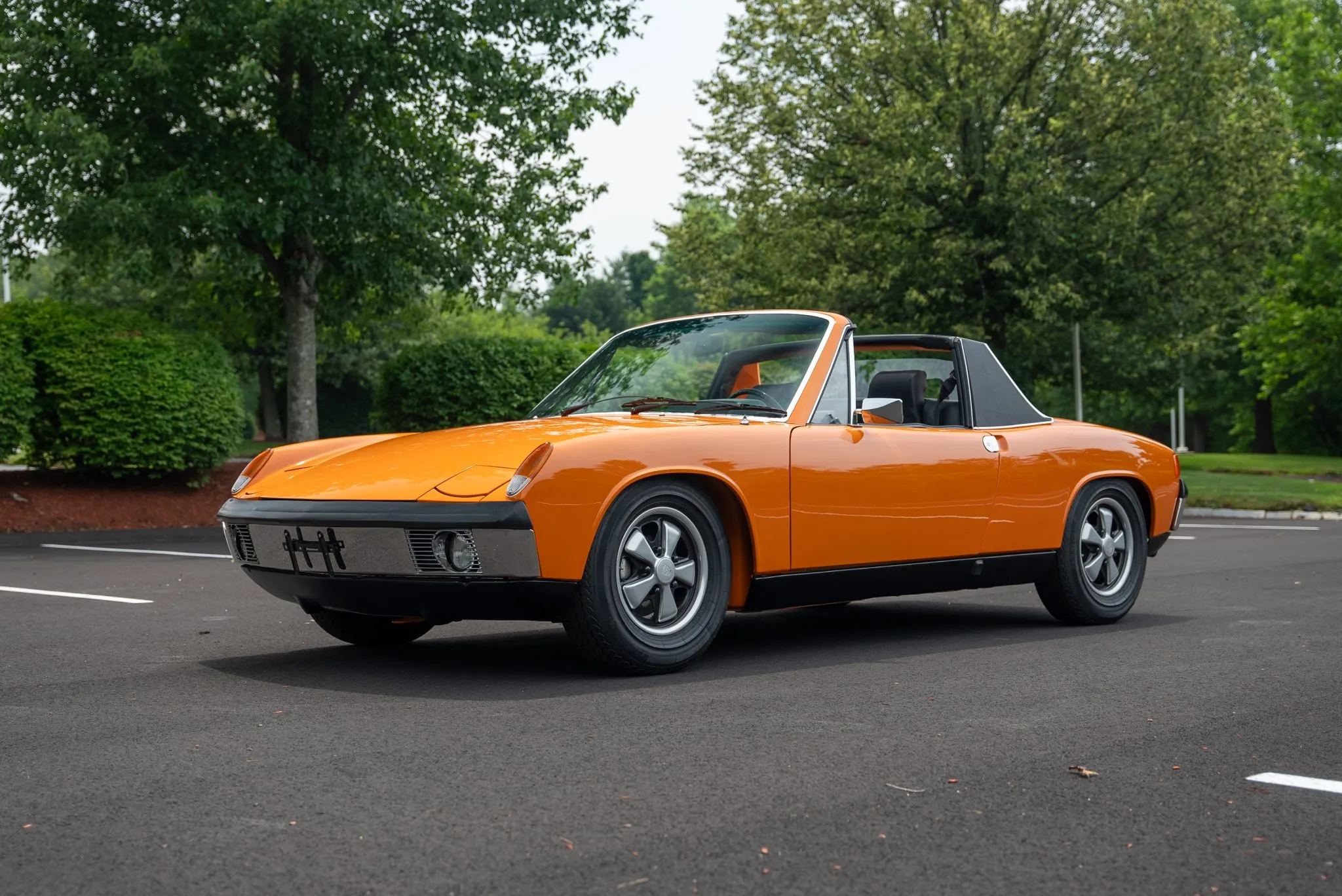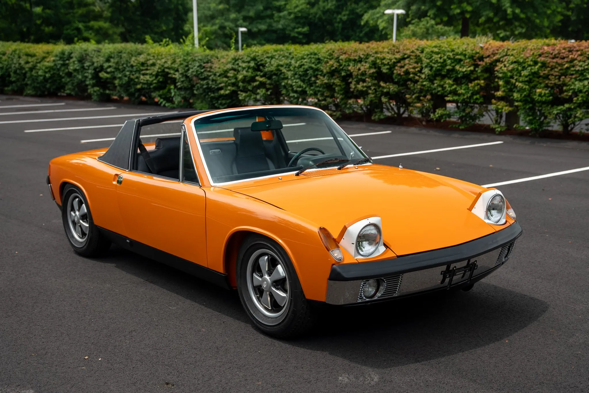 The exterior was carefully refinished after rust repairs were completed on the front fenders and left rear quarter panel. The car’s Targa top has been reupholstered, and various trim pieces were refinished to ensure the car retains its factory-quality appearance. Additional work included the restoration of the driving lights and the replacement of rubber seals throughout. Noteworthy features include pop-up headlights, a black removable Targa top, black sail panels, polished bumper trim, and European-market VW/Porsche badging on the rear panel.