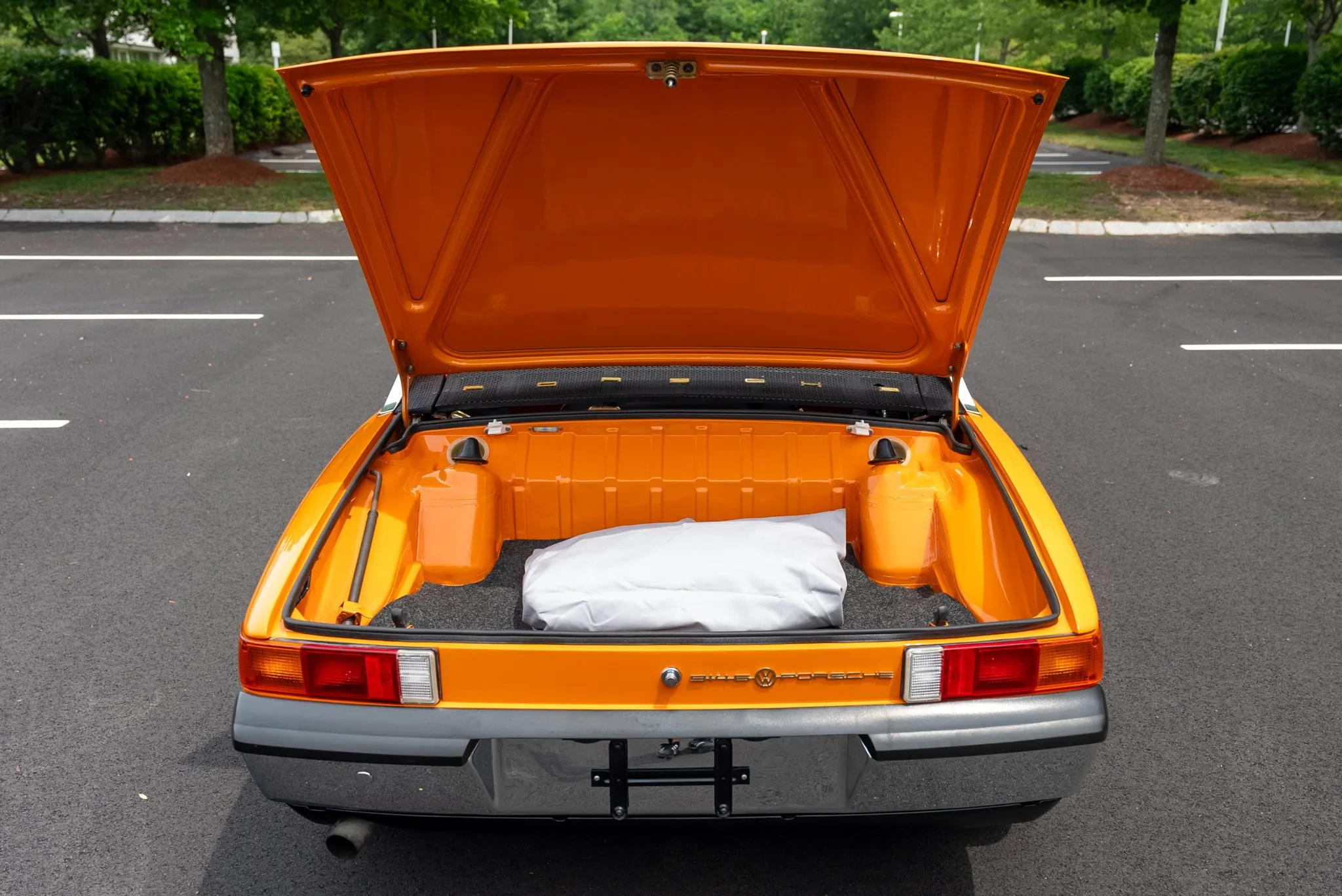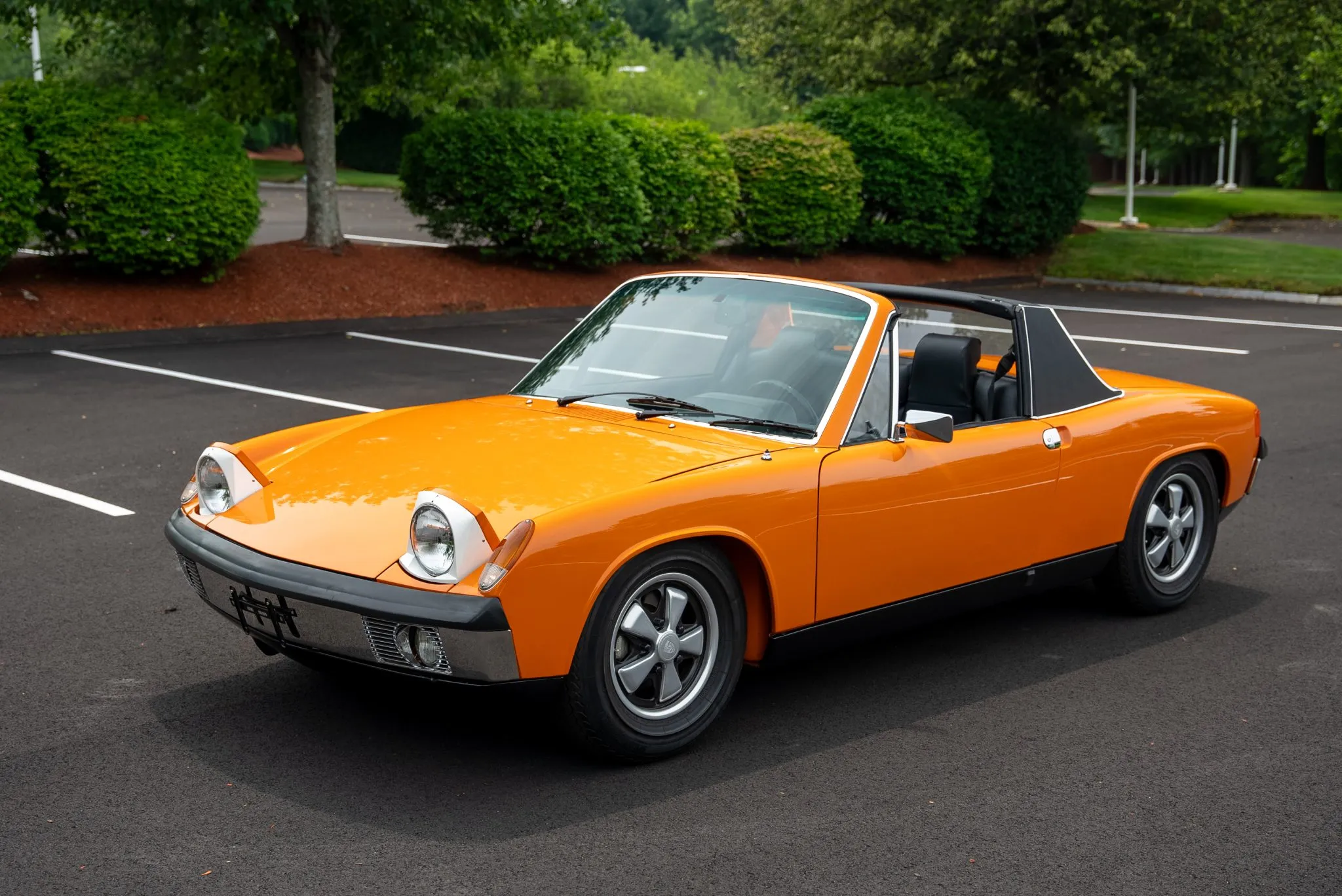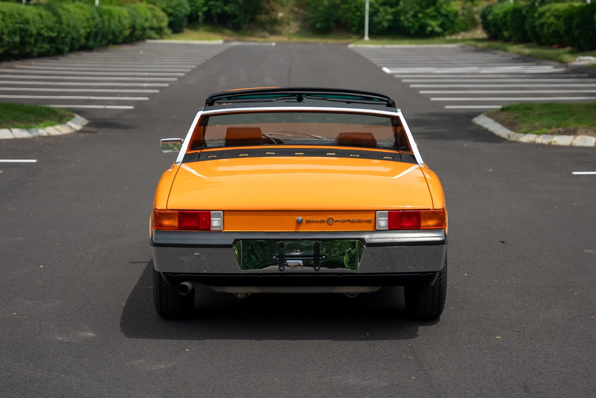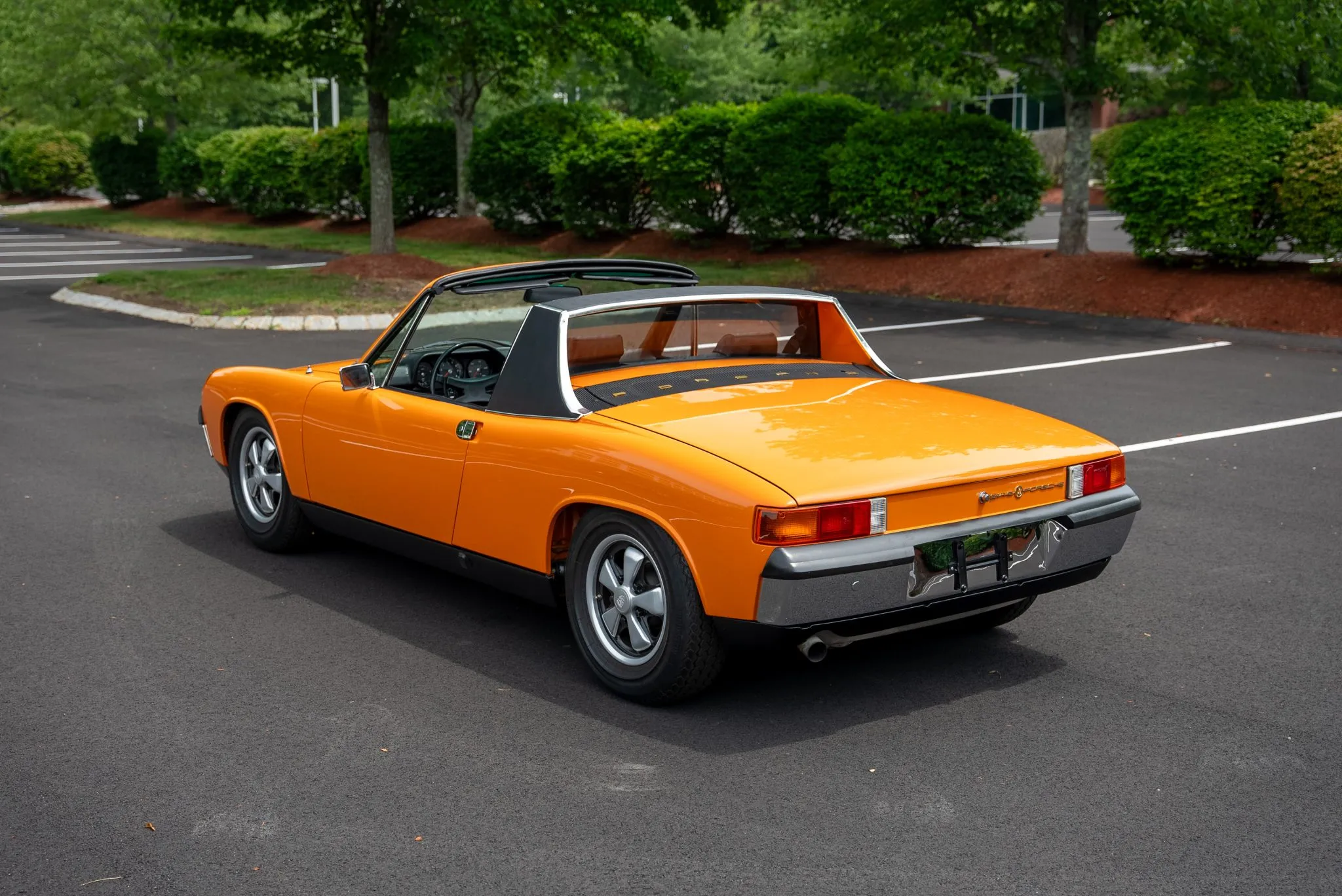 The exterior was carefully refinished after rust repairs were completed on the front fenders and left rear quarter panel. The car’s Targa top has been reupholstered, and various trim pieces were refinished to ensure the car retains its factory-quality appearance. Additional work included the restoration of the driving lights and the replacement of rubber seals throughout. Noteworthy features include pop-up headlights, a black removable Targa top, black sail panels, polished bumper trim, and European-market VW/Porsche badging on the rear panel.