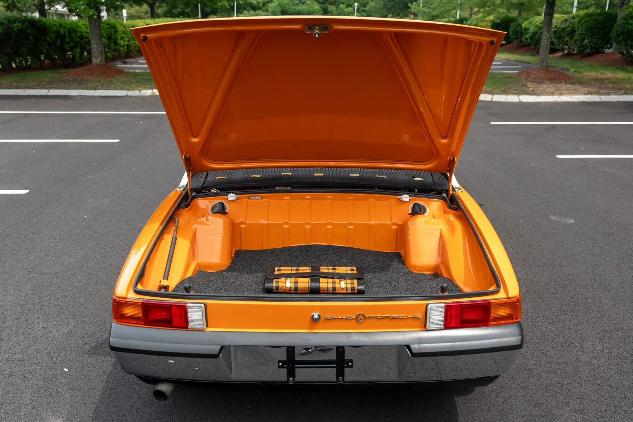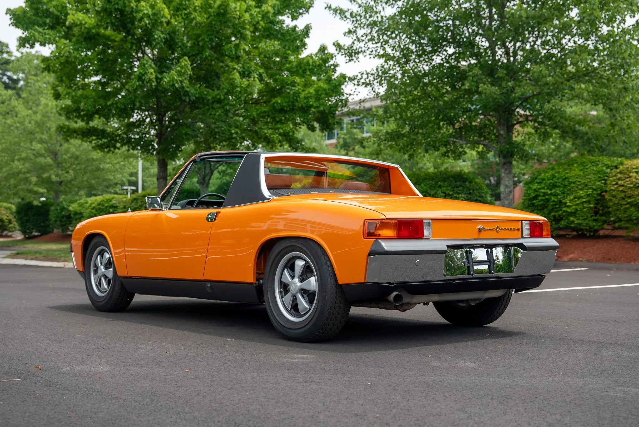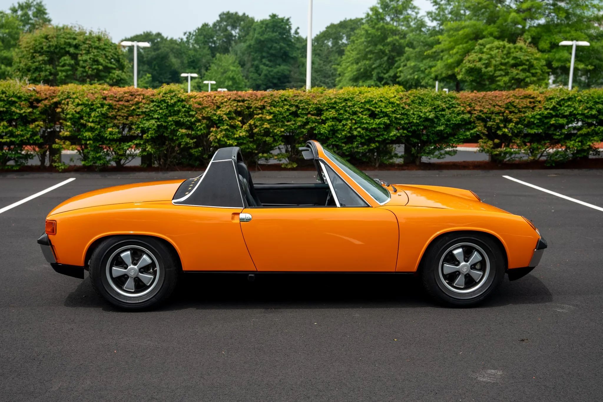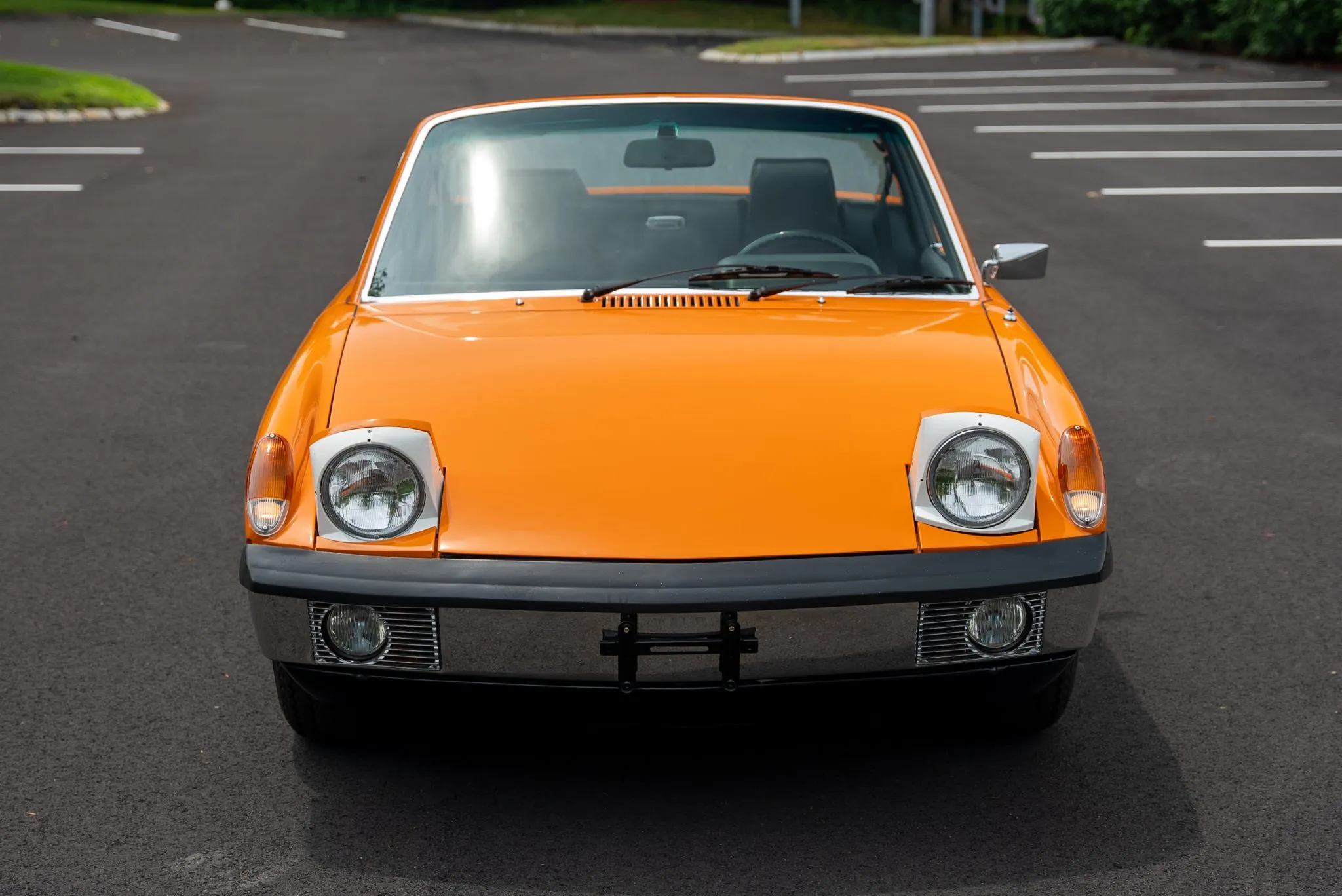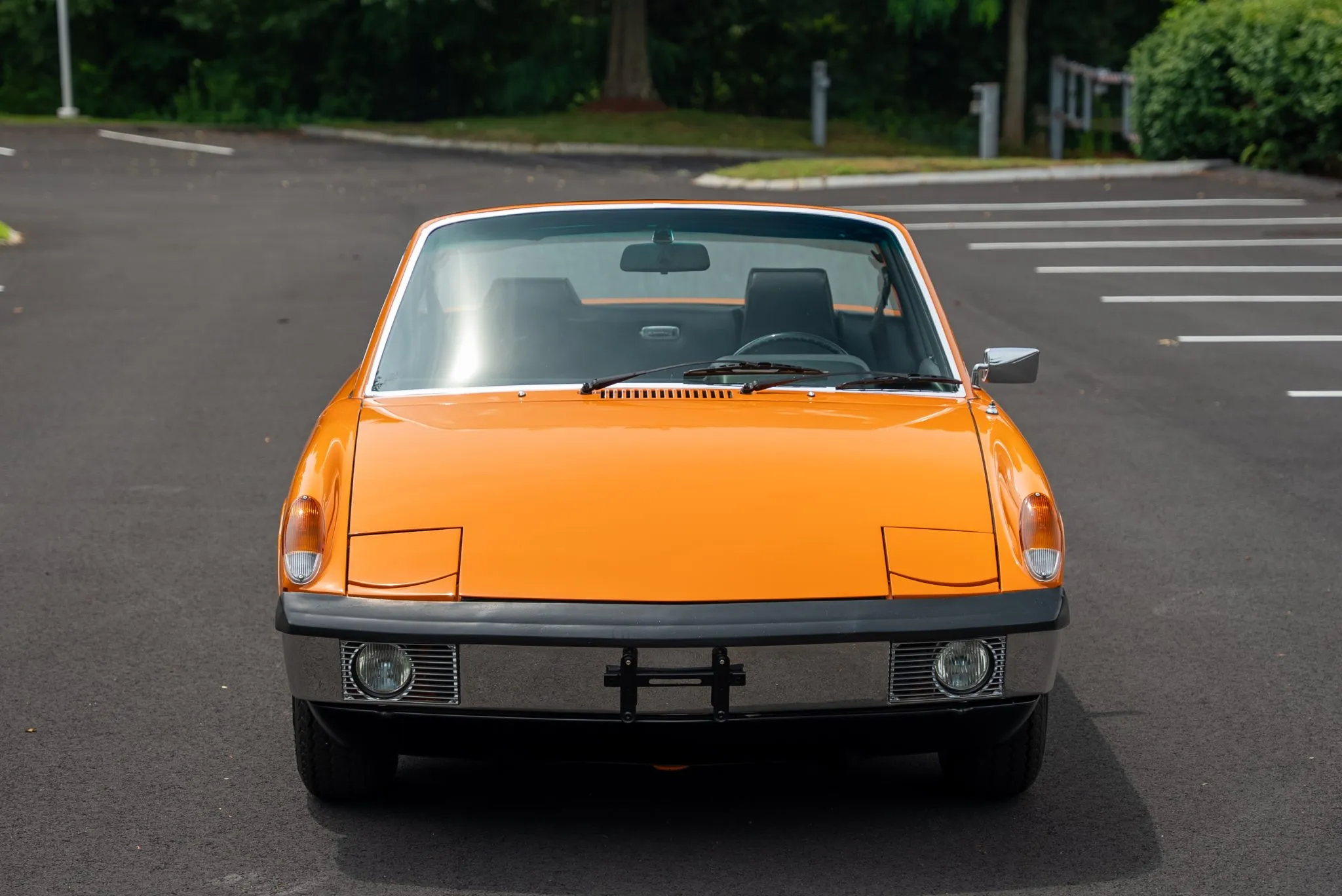 The exterior was carefully refinished after rust repairs were completed on the front fenders and left rear quarter panel. The car’s Targa top has been reupholstered, and various trim pieces were refinished to ensure the car retains its factory-quality appearance. Additional work included the restoration of the driving lights and the replacement of rubber seals throughout. Noteworthy features include pop-up headlights, a black removable Targa top, black sail panels, polished bumper trim, and European-market VW/Porsche badging on the rear panel.