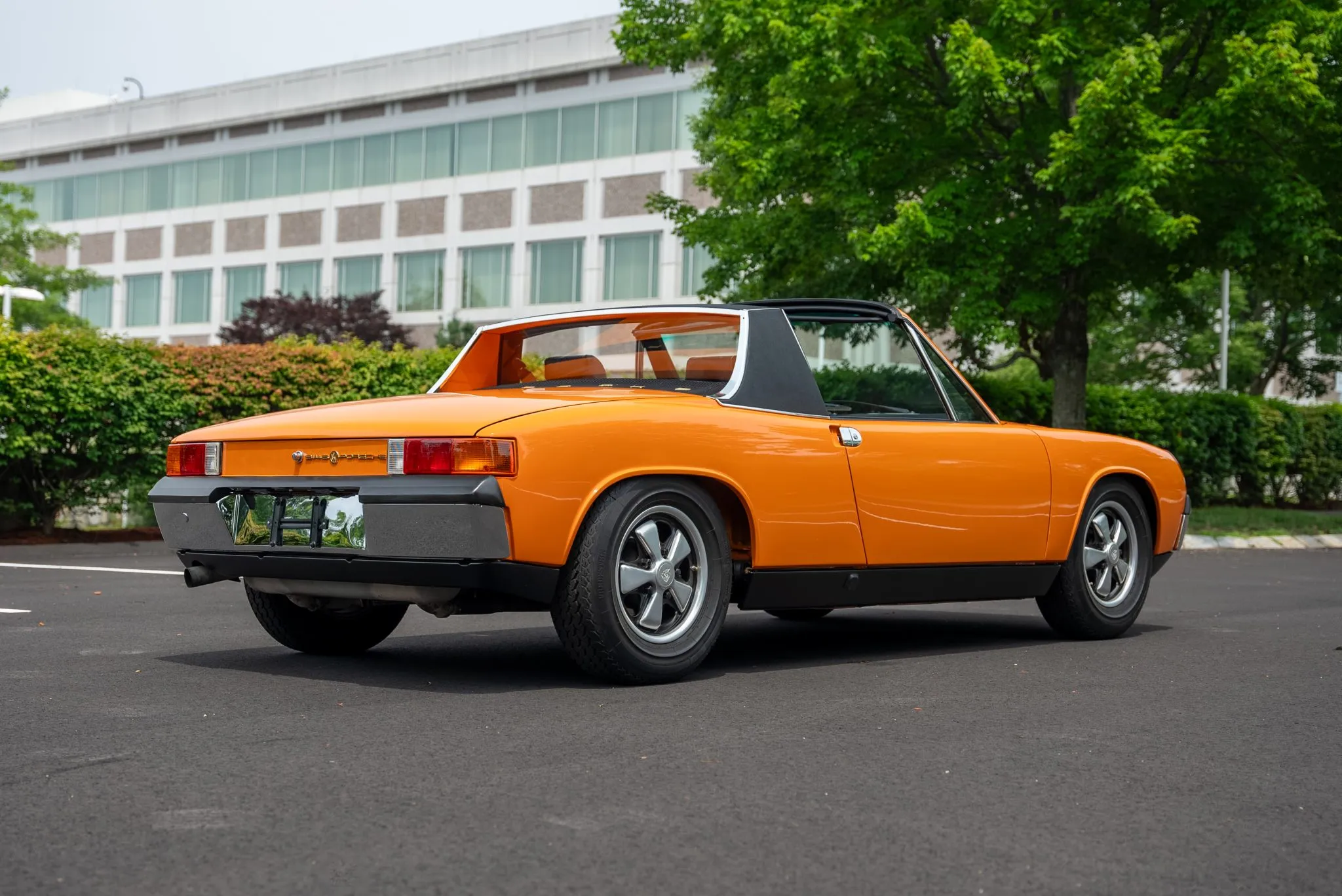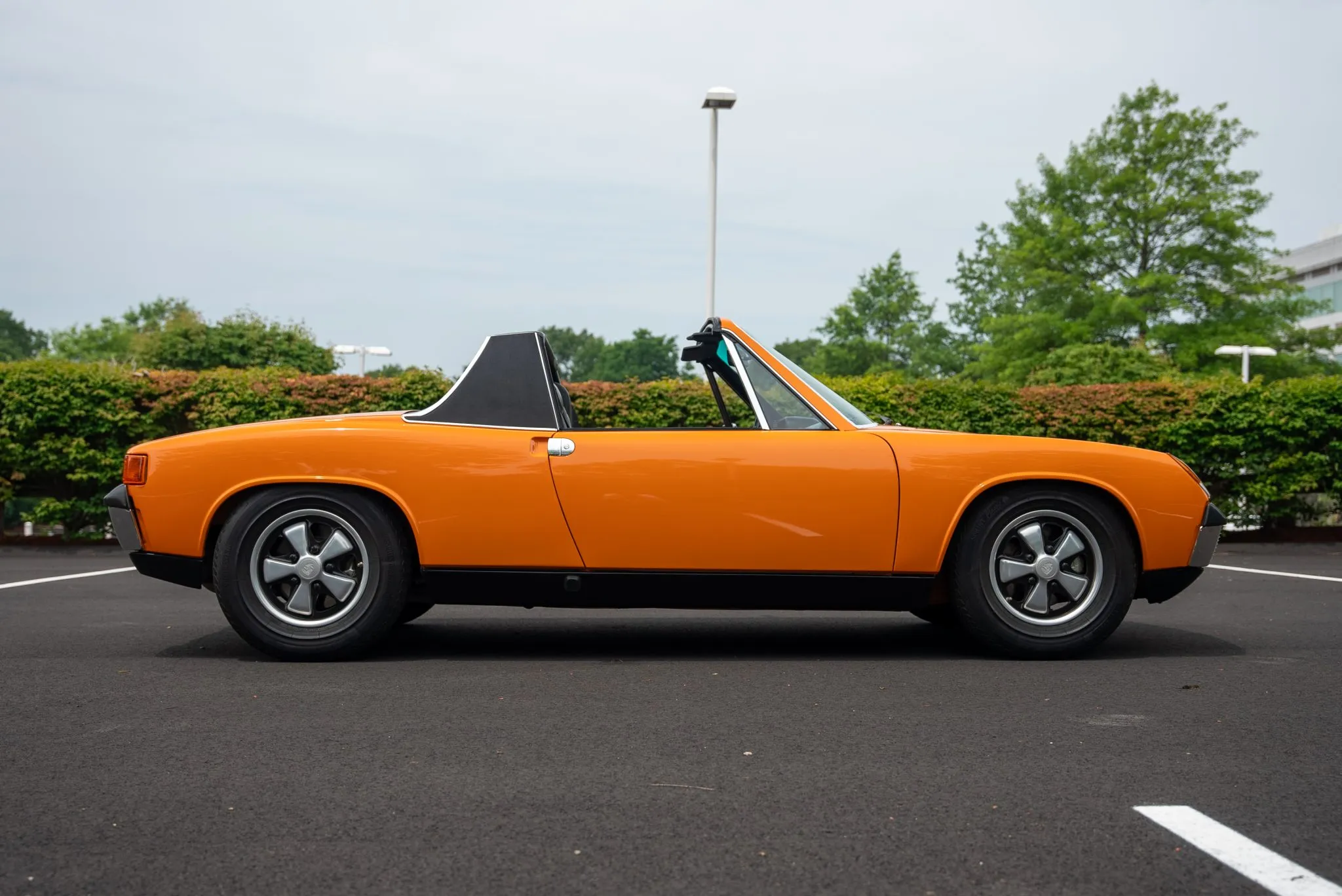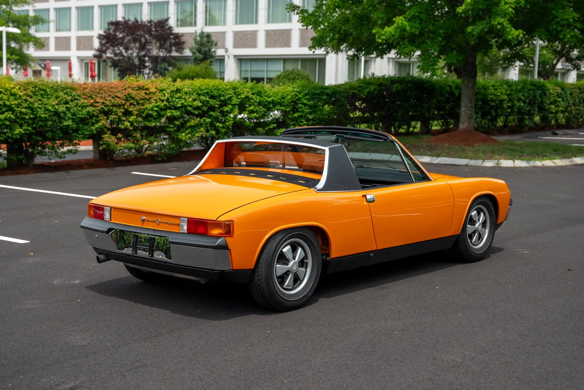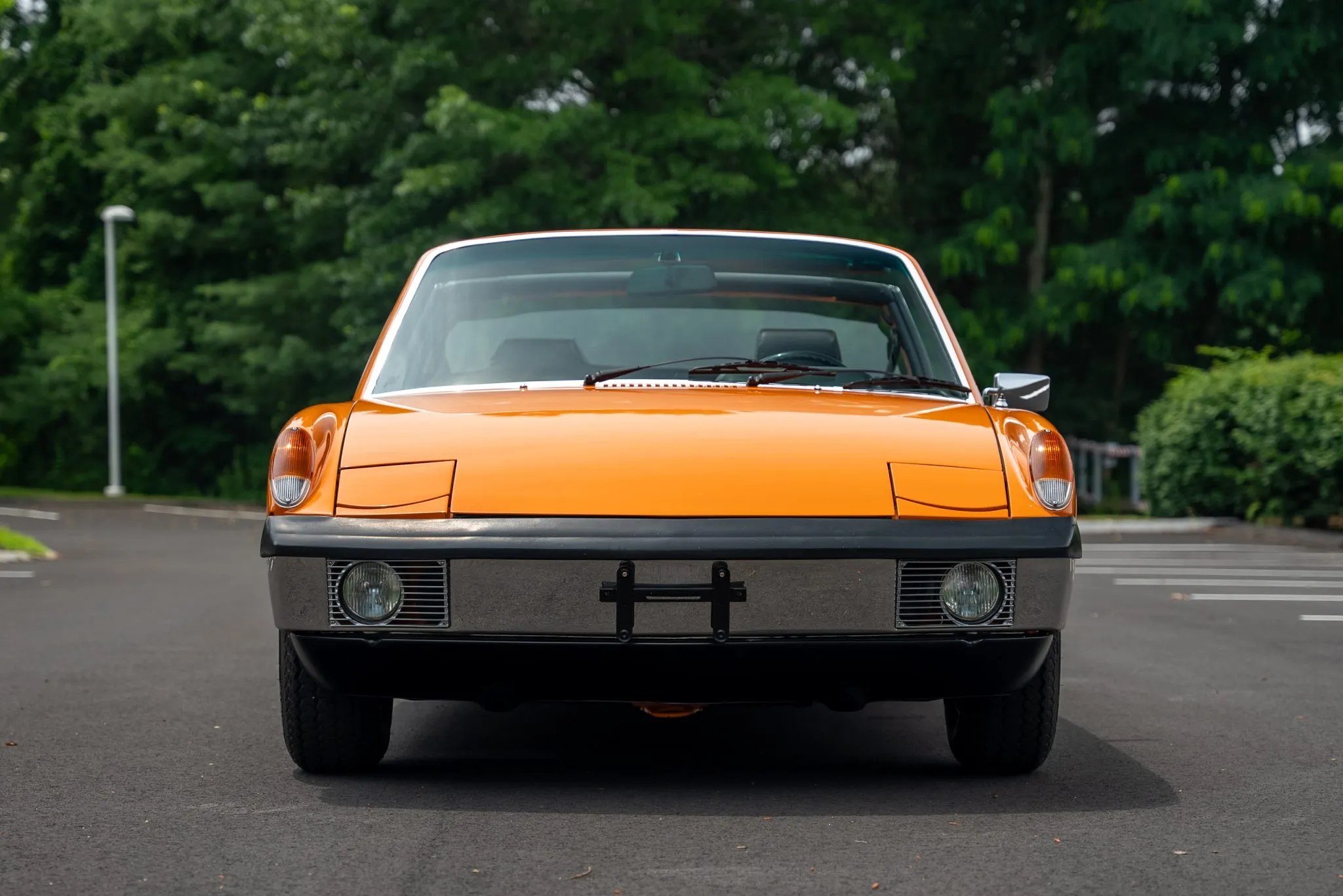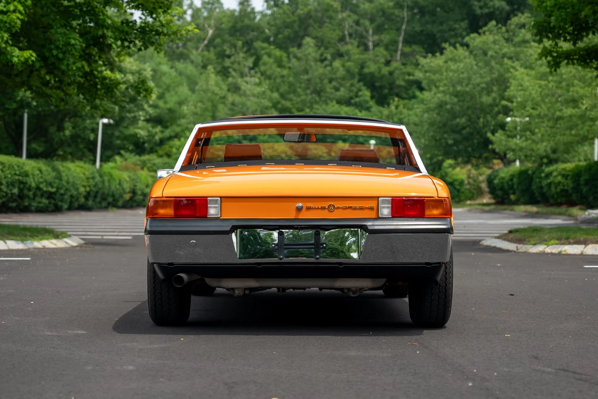 The exterior was carefully refinished after rust repairs were completed on the front fenders and left rear quarter panel. The car’s Targa top has been reupholstered, and various trim pieces were refinished to ensure the car retains its factory-quality appearance. Additional work included the restoration of the driving lights and the replacement of rubber seals throughout. Noteworthy features include pop-up headlights, a black removable Targa top, black sail panels, polished bumper trim, and European-market VW/Porsche badging on the rear panel.
